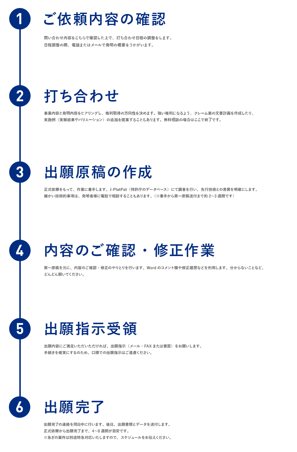 弊所では、手元にある資料とヒアリング内容を元に出願書類を作成しています。打ち合わせのために特別な資料をお作りいただく必要はありません。必要資料はこちらから提案・お願いします。(バリエーションの追加、データ提供のお願いなど、広い権利範囲の確保に必要なもののみ) 出願書類は、知財担当者だけでなく技術者の方も確認します。